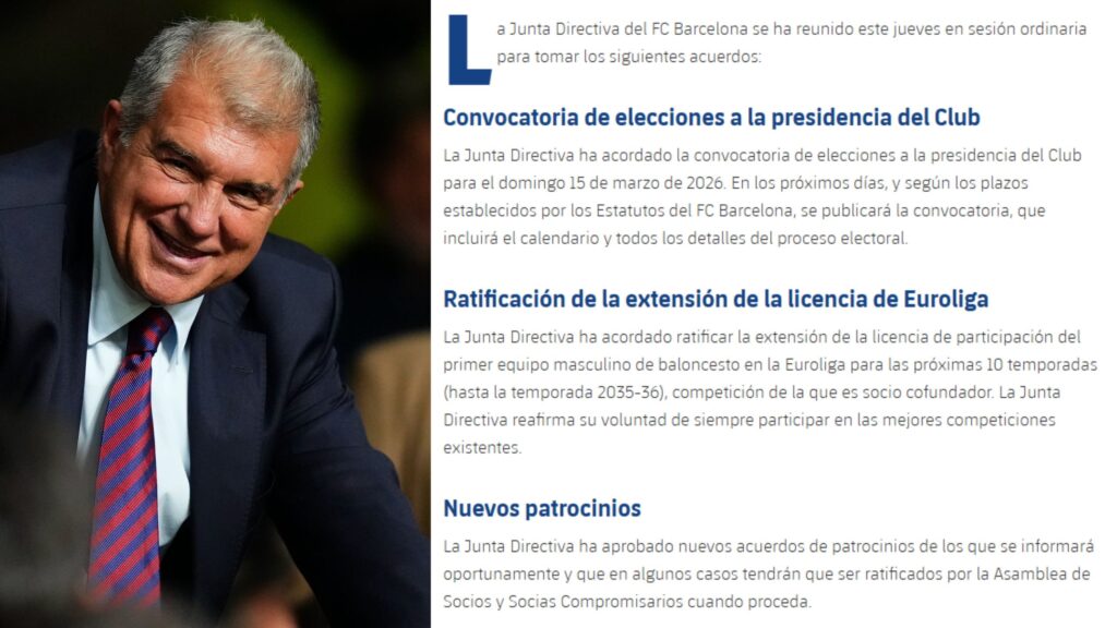 La Junta Directiva se reunió este jueves y soltó la bomba: las elecciones a la presidencia del FC Barcelona serán el próximo domingo 15 de marzo de 2026. La fecha coincidirá, según el calendario de la Champions, con el FC Barcelona vs Sevilla FC, lo que facilitará el voto de los socios que acudan al Spotify Camp Nou. Además, ese mismo día en el Estadi Johan Cruyff, el FC Barcelona femenino también tiene partido, por lo que se podrían habilitar también allí urnas para el voto.