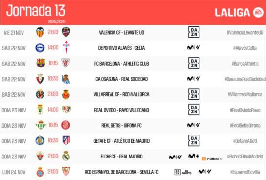 Calendario y horarios para la Jornada 13 de La Liga EASports del 22 y 23 de Noviembre.