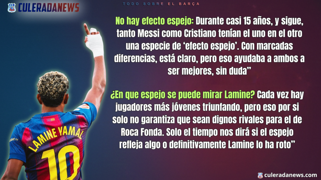 En la actualidad, y con el permiso de lo que suceda en el eterno rival de Madrid con figuras como Kylian Mbappé o Vinícius Jr., Lamine parece habitar en una dimensión distinta por estilo y precocidad. Si no surge un antagonista claro de su misma quinta, el peligro es el «efecto espejo»: verse solo en la cima. Para la cantera del FC Barcelona, Lamine es el espejo donde mirarse, pero para Lamine, el espejo debe devolverle una imagen que siempre quiera mejorar.