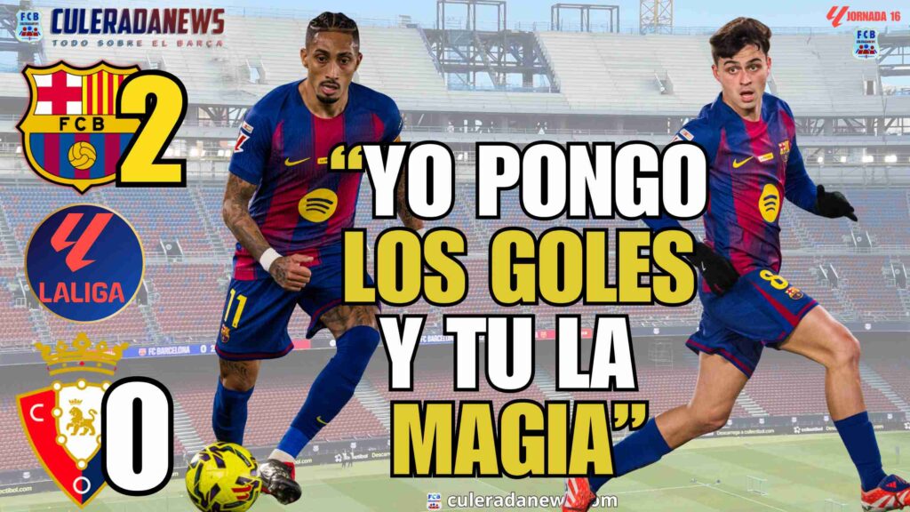 Spotify Camp Nou, 12 de diciembre, Rafa Nández, El FC Barcelona ha cerrado su participación en el Camp Nou en este 2025 con una importante victoria (2-0) ante un combativo Osasuna en la jornada 16 de La Liga EA Sports. El encuentro, que se mantuvo sin goles en el primer tiempo, se decidió en la segunda mitad gracias a la inspiración del extremo brasileño Raphinha, el gran protagonista de la noche.