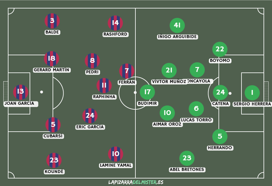 - 1-0, Minuto 70: Raphinha. El brasileño, asistido por Pedri, logró finalmente romper el muro navarro, anotando el gol que abría el marcador y daba la tranquilidad a los de Hansi Flick.
