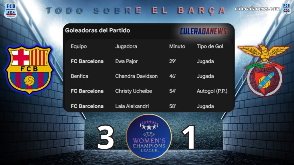 Barcelona, 11 de diciembre de 2025 – El FC Barcelona Femenino cosechó ayer una importante victoria (3-1) ante el SL Benfica en el Estadi Johan Cruyff, en un encuentro correspondiente a la quinta jornada de la fase de liga de la UEFA Women’s Champions League. El triunfo, que no fue sencillo, permite a las de Pere Romeu reafirmar su liderato y acariciar la clasificación directa a los cuartos de final.